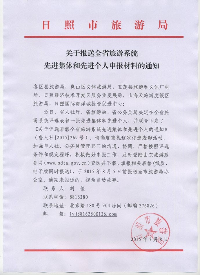 关于报送全省旅游系统先进集体和先进个人申报材料的通知(2015年07月08日)