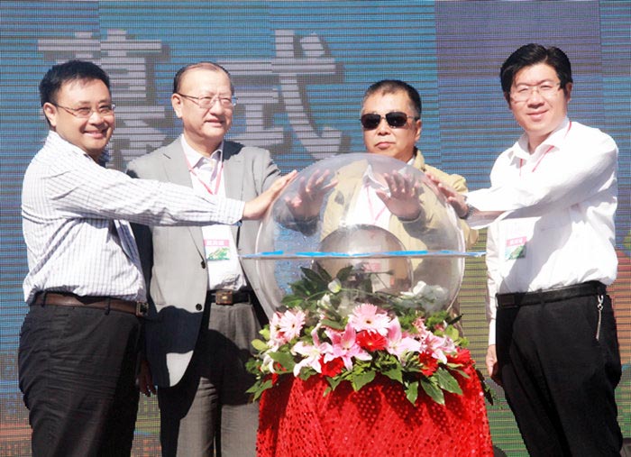 图/(左起)王春生副巡视员、全国休闲标准化技术委员会主任委员张灵光、刘汉奇秘书长、杨留星副市长共同启动蓝海1号营地开营水晶球
