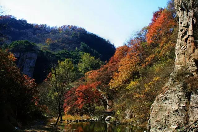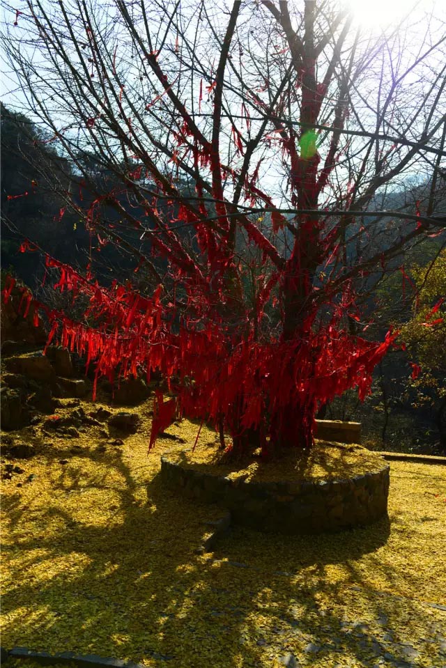 九仙山龙潭大峡谷开始了一年之中色彩最多的时节。斑斓的枫叶与蓝天、碧水,共同描绘了一副秋日的山水画卷。在峡谷中段的龙王庙,一株数百年的银杏树,她的枝叶也开始泛黄,待得秋风吹起,满地泛黄,仿佛仙境。