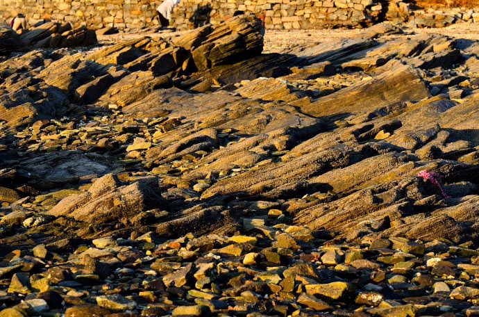 跟随孩子的视线会发现在礁石间有许多参差不齐的小水洼,他们用他们与生俱来的童真而又好奇地目光注视着水洼里形形色色的小海洋生物,这里属小螃蟹最引人入胜。