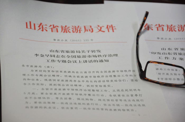 此前,国家旅游局在云南昆明召开了全国旅游市场秩序治理工作专题会议,在此背景下省旅游局为进一步整顿和规范我省旅游市场秩序,营造理性、健康的旅游发展环境,召开了此次全省旅游市场综合整治工作视频会议。会上,省旅游局分管副局长岳滨就此次整治工作的目标任务提出明确要求,他强调要通过开展全省旅游市场秩序综合整治行动,彻底打击“不合理低价、零负团费及强制购物”等严重扰乱旅游市场秩序行为,全面净化我省旅游市场环境,打造一个理性、成熟的旅游市场,维护“好客山东”的良好旅游形象,最后宣读了具体整治内容:(一)严厉查处旅行社以“不合理低价、零负团费”组织旅游经营管理活动的行为;(二)严厉查处强迫或者变相强迫游客购物或参加自费项目等违法行为;(三)联合公安、工商部门严厉查处无资质旅游业务的违法行为;(四)严厉查处未取得导游证或者领队证从事导游、领队活动的违法行为;(五)严厉查处导游、领队未经旅行社委派私自承揽业务的行为;(六)严厉查处不文明旅游行为。