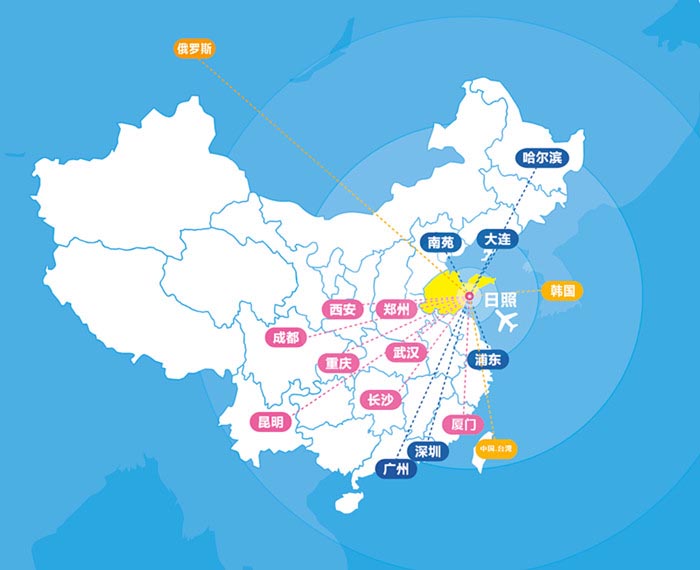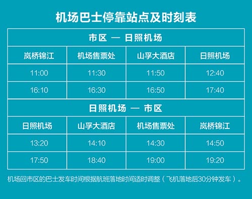 此外,机场大巴在日照市区设立两处停靠点,每天各有大巴往返日照市区和日照机场。