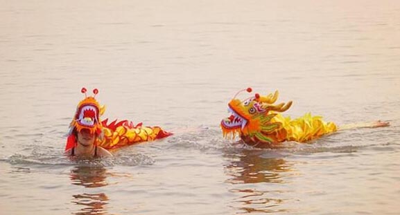 早上太阳刚一升起,担负舞龙任务的几名运动员就在凛冽的寒风中脱掉棉衣,換上泳装,披上鲜艳夺目的龙套面具走进刺骨的海水中。他们时躺时立、揺头摆尾、翻转腾越,互相变换着姿势和表演衣样。摆出“蛟龙出水”、“二龙戏珠”、“龙腾虎跃”等经典造型。