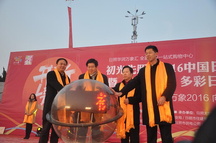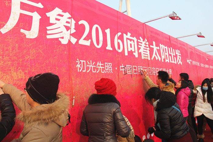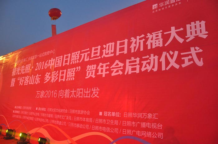1月1日,由日照市旅游局主办,日照市太阳文化研究会、日照市旅游协会承办的“初光先照•2016中国(日照)元旦迎日祈福大典”暨“好客山东 多彩日照”启动仪式在日照市万平口风景区隆重举行。迎日出祈福大典自2010年起至今已连续举办7届,此次活动由华润万象汇冠名支持。日照市人大常委会副主任梁云爱、日照市人民政府副市长杨留星、日照市旅游局局长王均波,日照日报社、日照市文广新局、日照市体育局、日照广播电视台、华润万象汇、太阳文化研究会等部门领导莅临活动现场。日照市市民及游客共9万余人参加了活动。