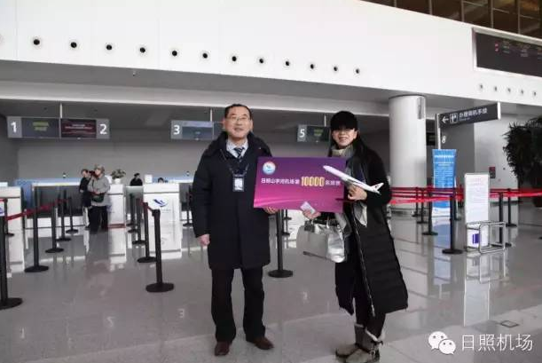 自日照机场2015年12月22日通航以来,市民反响热烈,乘机意愿踊跃,在1月19日的FM9125日照通往大连的航班上,日照机场迎来了通航后第10000名旅客,在日照工作的姜女士正准备乘机前往大连出差,幸运获得此独特纪念。日照机场建设推进工作办公室副主任庄光志代表机场向姜女士赠送了纪念品并合影留念。日照机场在单条航线通航不到一个月的时间里就实现了旅客超万,按此估算就可实现年旅客吞吐量12万人次以上。