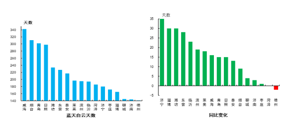 “蓝天白云,繁星闪烁”天数日照排全省第四名,其中,最多的城市是威海市,为342天,最少的是德州市,为141天。“蓝天白云,繁星闪烁”天数同比增加最多的是济宁市,增加35天;菏泽市同比持平;仅德州市同比减少2天。