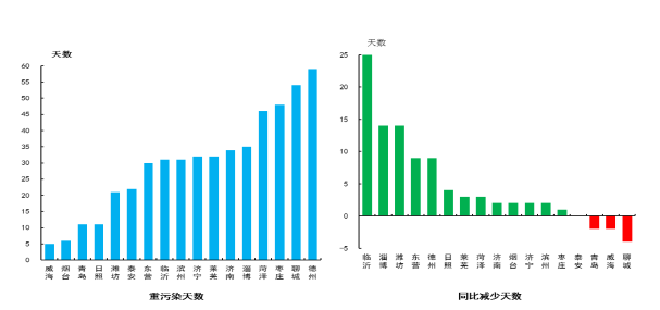 重污染天数最少的是威海市,为5天,日照位居全省第四,而重污染天数最多的是德州市,为59天。重污染天数同比减少最多的是临沂市,减少25天;泰安市同比持平,同比增加最多的是聊城市,为4天。