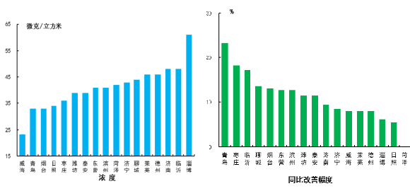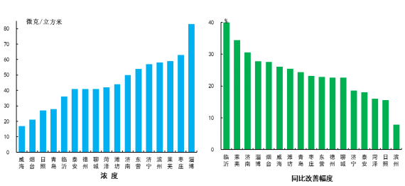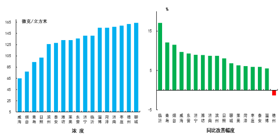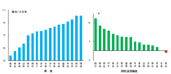 细颗粒物浓度最好的城市是威海市,为38μg/m3,最差的城市是德州市和聊城市,为101μg/m3;同比改善幅度最大的城市是临沂市,为17.4%;东营市同比持平;仅聊城市同比恶化1%。