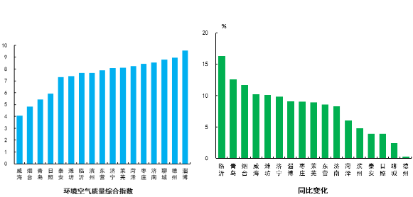 环境空气质量综合指数最好的城市是威海市,为4.06,最差的城市是淄博市,为9.56,日照环境空气质量综合指数拍全省第四名。