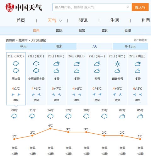 1月21-22日,天门山景区以小雨及雨夹雪天气为主,温度将降至到4摄氏度左右,天气寒冷,外加雨雪相伴,游客朋友们除带好雨具外,更要及时添加保温衣物。同时,在景区游玩,在室外活动的时间会较长,可以选择一些防滑保温的鞋子穿着,如:登山鞋,雪地靴...