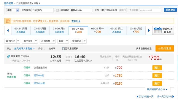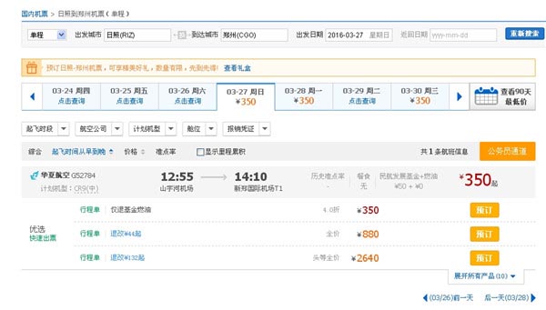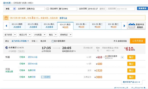 根据携程网的消息,目前在携程网自3月27日起已经可以预定日照至北京、郑州、重庆、厦门的航班飞机票。