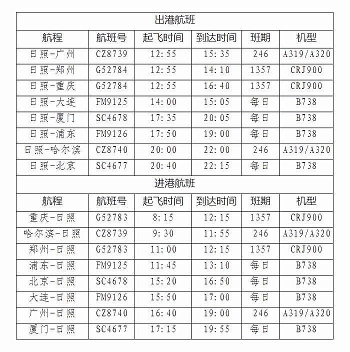日照机场将于3月27日开通两条新航线,分别是北京(首都)—日照—厦门航线和重庆—郑州—日照航线。两条航线分别由山东航空和华夏航空执飞。日照机场新航线开通后,运行航线将达到4条,通航点将增加到8个,通航点覆盖我国的主要枢纽机场,方便市民出行。 此外,日照至西安、北京(南苑)的正班航线以及太原等地的旺季旅游包机航线,计划将在今年夏秋航季季中开通。还将适时开通至韩国的国际包机航线。 日照机场自去年12月22日通航以来,相继开通了上海(浦东)—日照—大连航线和哈尔滨—日照—广州航线。今年以来至2月底,机场共保障航班起降348架次,旅客吞吐量31101人次,平均客座率达到60%以上。 附:日照机场夏秋航班表