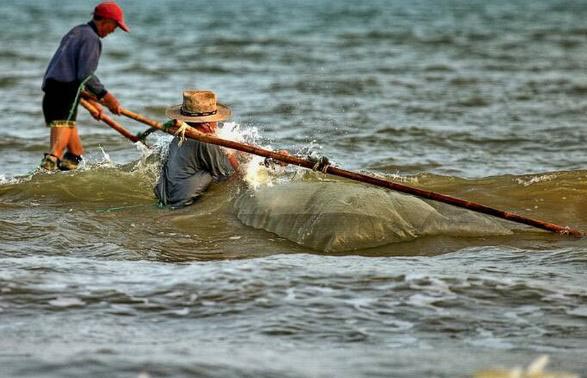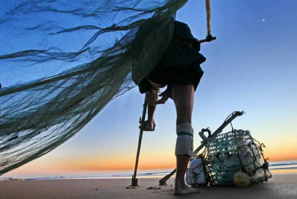 海虾生性胆小,活动在岸边平坦的浅水水中,如果用船捕捞往往会受惊而逃。因此,这里的先民创造了踩着高跷捕捞海虾的劳作方式。他们所用的虾网如同簸箕,网杆长达5米多,网口宽度也近4米;所踩的高跷,一般分为两到三节,每节高约1米,根据距离海岸的远近,随海水的深浅而增减高跷的木杆。