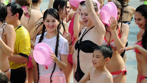 多名热情、火辣、狂野而具有活力的美少女着比基尼,拿着水枪,跟游客互动;