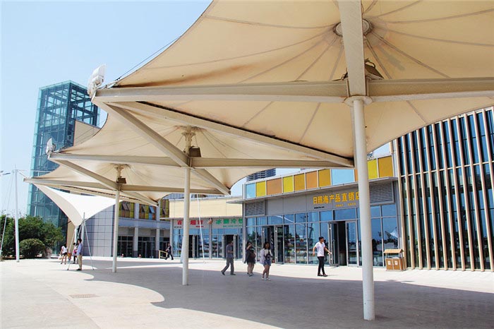 它们采用了环保理念,屋顶设有太阳能电池板,连续阴雨天一周内,能保证整个板房正常照明,电量不足时,可自动切换为市电负载供电的发电设备。主要用作广场游客服务中心、特色旅游纪念品售卖等服务。