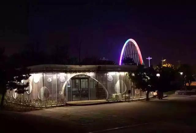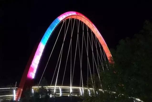 由钢结构和芬兰木(生长在芬兰,抗寒防腐)完美设计结合的桥叫做彩虹桥,整体造型像天空中一道彩虹,夜晚桥身上镶嵌的LED灯就会变幻出红橙黄绿青蓝紫般的“梦境”犹如置身于梦幻星空。