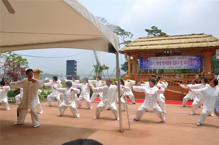 在活动现场,日照碧波国际旅行社组织游客进行太极拳表演,与韩方进行了热烈的互动。碧波国旅组织输送了多个游客团队到韩国,促进当地经济发展,加深了两地的友谊。