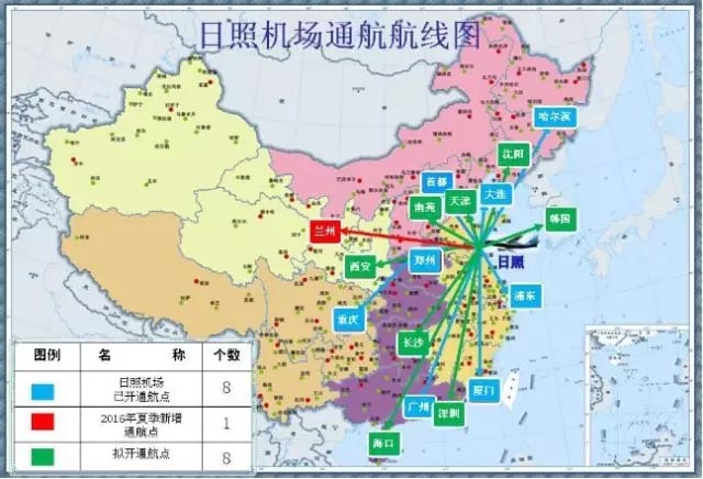 兰州航线开通后,日照机场运行航线数量将达到5条,合作航空公司5家,通航点9个,分别为北京首都、上海浦东、广州、重庆、哈尔滨、厦门、大连、郑州、兰州。通航点覆盖我国华北、华东、华南、西南、东北、华中、西北的主要枢纽机场,极大的方便了市民公务、商务、旅游出行,此外,市民还可通过这些通航点转机前往国内乃至世界各大城市。