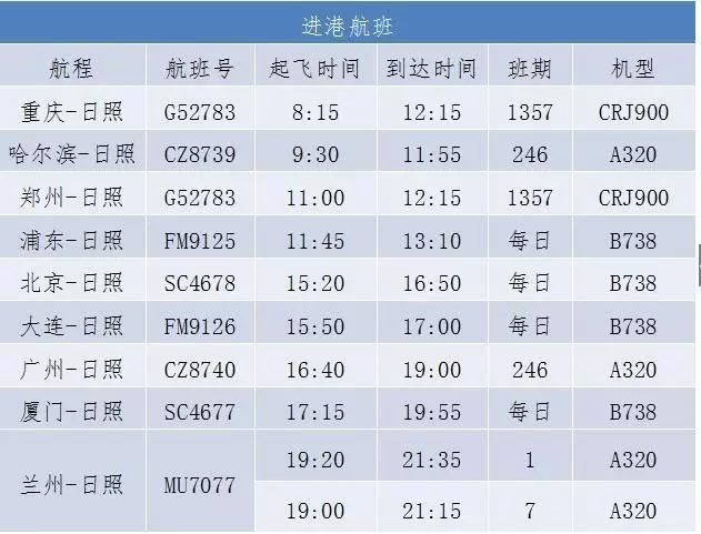 日照机场2016年夏秋航季航班时刻表(7月以后):