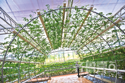 有的蔬菜种在地上,有的则种在半空中。走在两处菜地之间供行走而搭建起长廊里,抬头一看,就是种在半空中的南瓜,这些南瓜被种在一根白色的粗管里,管里是保证它们生长的无公害营养质。而像中八叶和紫晶等叶类蔬菜,则是雾化栽培,每一株,都勃勃生长,充满生机。