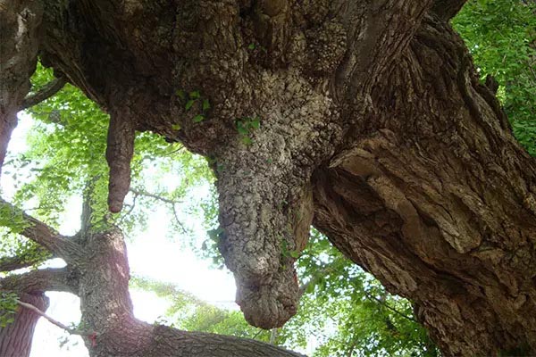 大家一定清晰记得,在那粗如巨梁的侧枝虬干上,生长着许多大大小小的树瘿,就象石钟乳一样悬垂在枝干上。这是一种独特的副根,在当地被称作“膫”(读liao)。当地民间流传的一句歇后语:白果树下扔石头——打撩(膫),就由此而来。据说这棵古老银杏树上的树瘿,如果把它锯下来,解成板,打磨光洁,就会显现出千姿百态的花纹来——行云流水、飞禽走兽、奇峰怪石、花草树木,什么都有。把它镶嵌在红木框架里,就成了官宦豪门厅堂里最珍贵的摆设。可是,神物不可亵渎,不容侵害,否则就要受到天诛。