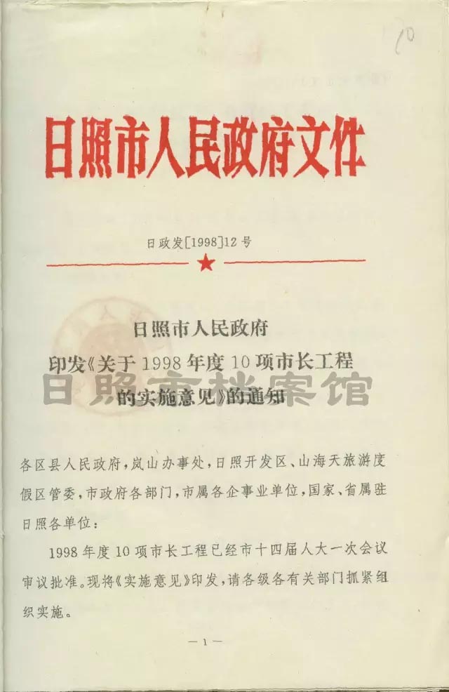 日照市人民政府印发《关于1998年度10项市长工程的实施意见》的通知(1998年3月10日)