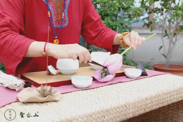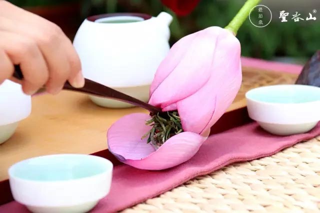 采一茎含苞欲放的荷花。插入盛满清水的瓶中。从顶部轻轻拨开荷的花瓣,把茶叶塞入花骨朵内,然后让花苞自动闭合。