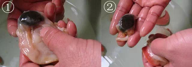 第一步:把尾部最外面两个小脚拧断,然后捏着尾部轻轻往上一折,再拧掉。