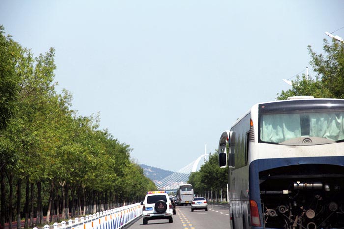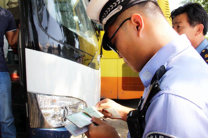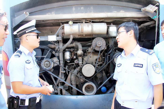 检查中,发现一辆没有后引擎盖、没有车牌的旅游大巴。市交警直属大队三中队指导员杨善明介绍,这辆鲁H.J8127客车,未悬挂后车牌,根据道路交通安全法,应给予200元罚款,记12分处罚。