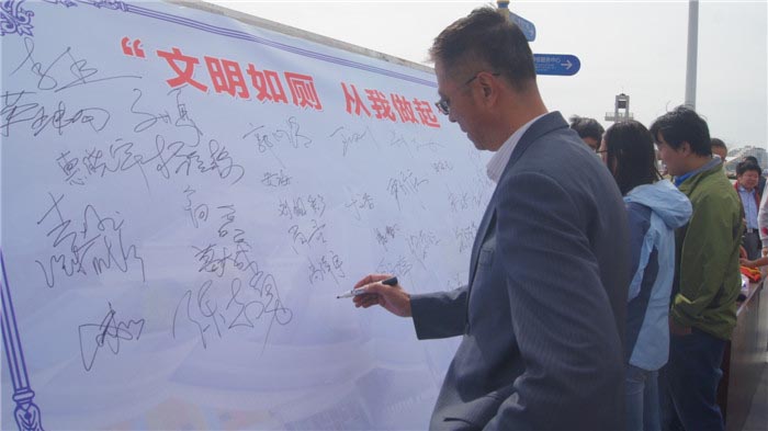 虽然一场秋雨让日照市的气温有所下降,但是广大市民、游客参与活动热情丝毫不减。活动向广大游客和市民发出倡议,争当文明如厕的示范者、监督者和推动者,加强自身文明修养,营造文明如厕良好氛围;呼吁各类企事业单位、社会服务单位和商业体厕所免费对游客开放,主动承担社会责任和义务;推动景区景点、车站、码头、加油站、集散中心等窗口服务单位,进一步优化如厕环境,提供更加周到的如厕服务。活动第三项进行签字仪式。