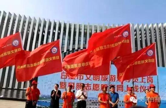 8月13日,日照市文明旅游劝导员上岗暨日照志愿服务网上线仪式在市规划展览馆举行,文明劝导员们举起了旗帜。