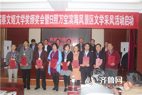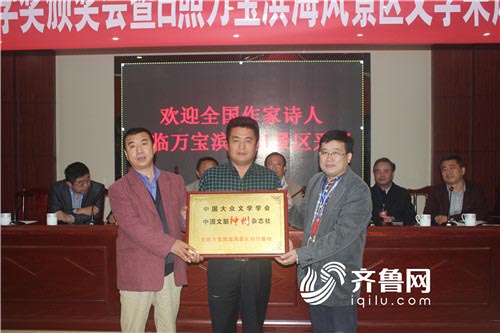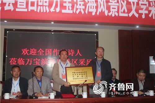 10月16日,首届蔡文姬文学奖颁奖会暨日照万宝滨海风景区采风活动在日照万宝滨海风景区开幕。 内蒙古作家协会副主席、中国西部散文学会副会长张继炼; 黑龙江省作家协会《北方文学》杂志社社长、主编佟坤;山东省作家协会散文创作委员会副主任、著名散文家李登建;作家报社总编辑张富英;中国大众文学学会副会长张殿武以及来自全国各地的作家和诗人在万宝滨海风景区研讨文学,并进行采风,收集创作灵感。 日照市万宝水产集团总经理张军华在开幕式上致辞,他说万宝水产集团立足现代水产育苗、养殖,转方式、调结构,企业规模、经济效益快速扩大和增长。先后荣获省“农业先进集体”、“省级文明单位”、 农业部“水产健康养殖示范场”、“省级农业产业化重点龙头企业”等荣誉称号,2012年获评全国休闲渔业示范基地。近几年,万宝水产集团在强化渔业支撑的基础上,加强道路等基础设施建设,不断改善环境质量,充分发挥资源优势,大力发展休闲渔业,开发建设了万宝滨海风景区。先后推出了赶海园、垂钓园、海水浴场、民俗风情园、贝尔乐园、海洋牧场、民俗旅游小镇等旅游景点,开发了赶海、垂钓、海水洗浴、海上休闲垂钓采摘、民俗风情表演、民俗旅游度假等旅游项目,景区旅游内容日渐丰富。同时,景区不断加强旅游秩序管理,规范旅游服务,旅游市场知名度和影响力不断提高。目前,景区已形成一个以赶海、垂钓、海水洗浴、民俗表演、休闲度假为主,集吃、住、游、购、娱于一体的特色旅游景区。 下一步,万宝水产集团将抢抓日照市“旅游富市”的战略机遇、借助山海天打造“海乐湾”项目的东风,将文化、渔业、旅游等元素有机结合,致力于全市文化旅游发展的先行先试。未来五年,万宝滨海景区将继续投资1.1亿元,集中建设万宝国家级海洋牧场等海上休闲旅游项目,打造独具山海天特色的精品文化旅游及休闲渔业品牌,为日照海洋可持续开发利用做出新的贡献。 之后,在会上公布了首届蔡文姬文学奖第二批日照颁奖会获奖名单并颁奖,颁发了“德艺双馨优秀作家”和“签约作家+特约研究员”证书。日照万宝滨海风景区获得中国文联神州杂志社、北方文学杂志社、作家报社、青海湖杂志自然人文版共同颁发的“最佳旅游胜地”称号匾牌,并举行了中国大众文学学会和中国文联神州杂志社“创作基地揭牌仪式”。