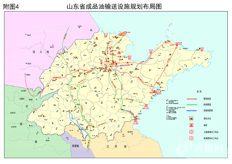 山东省发改委、经信委、交通厅联合出台全省油气输送设施规划建设方案,提出将在青岛、日照、烟台、潍坊、东营、滨州等港口规划新建13座原油码头、38座油品和液体化工品码头以及3座LNG码头,建成主要服务省内、辐射周边省份的油气海运体系。 管网建设方面,改造淘汰老旧管道,新建7条原油管道、7条成品油管道和7条天然气主干管道,年输送能力分别达到12800万吨、4450万吨和410亿立方米。