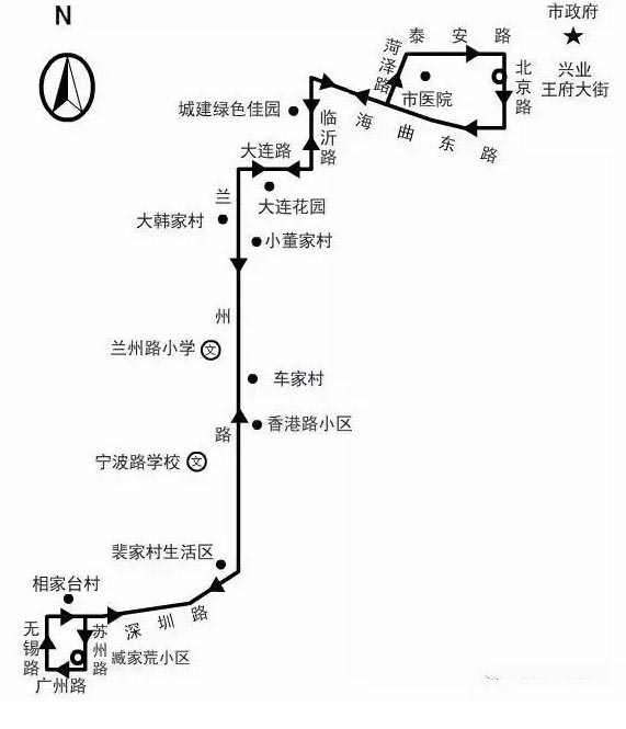 一、起讫站点 臧家荒小区——兴业王府大街 二、线路走向 上行:臧家荒小区经广州路至广州路小学东,经无锡路至南岭居民区,经深圳路至相家台、李家庄子、南张家村,经兰州路至宁波路学校、车家村、小董家村,经大连路至大连花园、天安家园,经临沂路至宋家湖、城建绿色佳园,经海曲路至济宁银行日照分行,经菏泽路至市医院西门,经泰安路至市医院、中国人民银行,经北京路至兴业王府大街; 下行:兴业王府大街经北京路至兴业世纪城,经海曲路至四季春城、济宁银行日照分行,经临沂路至城建绿色佳园、宋家湖,经大连路至天安家园、大连花园,经兰州路至小董家村、车家村、宁波路学校,经深圳路至南张家村、李家庄子,经苏州路至臧家荒小区; 三、首末班时间及票制、票价 4月~10月:首班6:20,末班臧家荒小区18:40,兴业王府大街18:50 11月~3月:首班6:20,末班臧家荒小区18:10,兴业王府大街18:20 该线路实行一票制,票价一元。使用公交IC卡按现行标准执行。