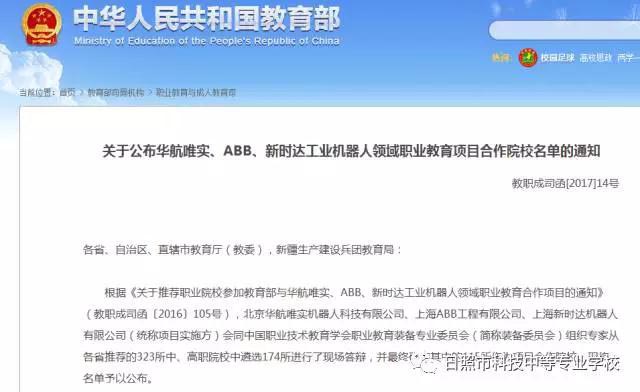 2016年6月,国家教育部与北京华航唯实机器人科技有限公司、上海ABB工程有限公司、上海新时达机器人有限公司签署《工业机器人领域职业教育合作备忘录》(简称《备忘录》),支持上述3家公司(统称实施方)在工业机器人领域发挥优势,促进职业院校相关专业创新技术技能人才培养模式,提高专业内涵建设水平,建设技术研发中心,提升教师科研及技术服务能力。通过院校申报、省级专家评审推荐、教育部等部门专家现场答辩等环节,最终确定115所项目合作院校,其中,开放式公共实训基地15所,应用人才培养中心100所。本项目建设周期为三年,在教育部指导下,实施方向项目合作院校赠送设备、课程、软件、培训和服务等,项目总价值约3亿元。