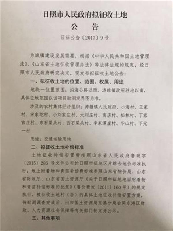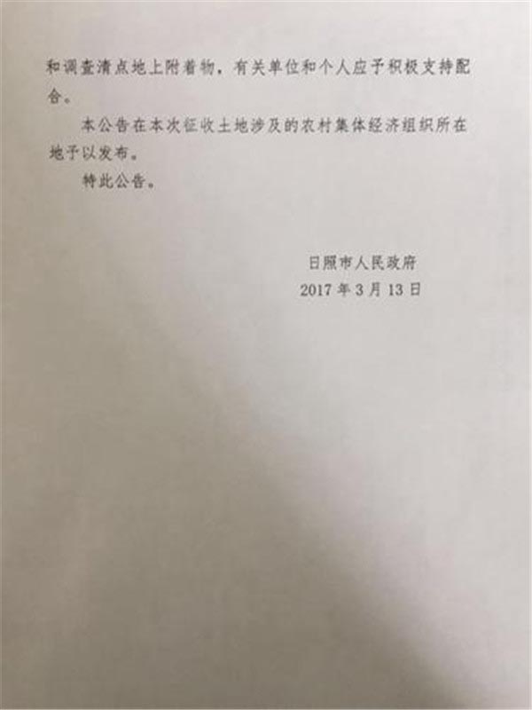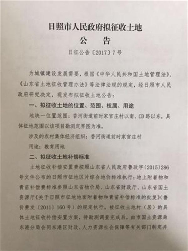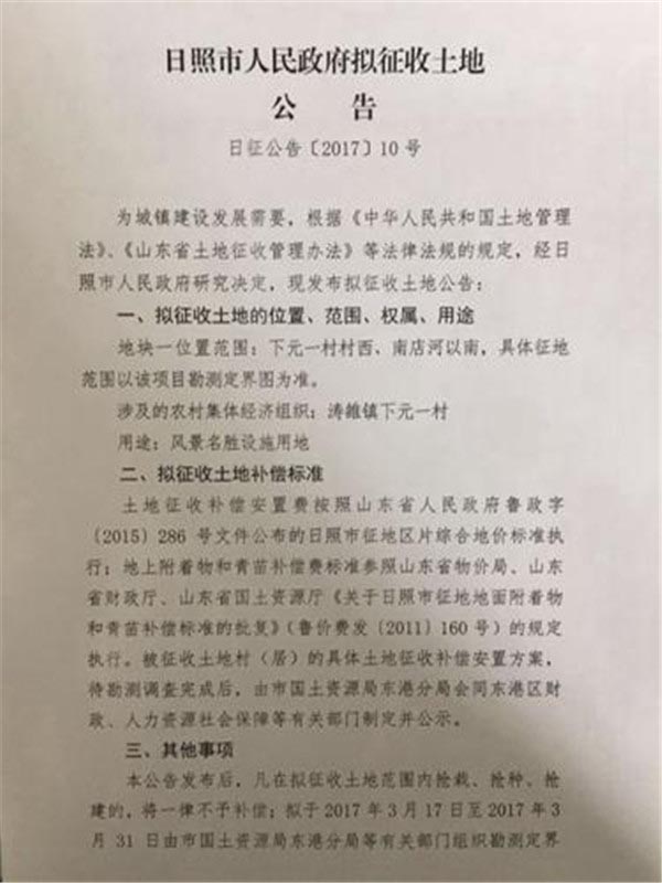 日照市拟征收土地公告:用于教育、交通和风景名胜建设(2017年03月14日)