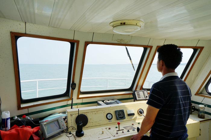 在任家台渔港坐着游船出海,感觉真是好,尤其是旺季来临前的这一段时间,天气也热了,太阳还不算太晒,游船上面的游客也不多,可以满船上上下下任意的溜达,连驾驶舱都可以随便进出,只要你不打扰开船师傅的工作。行驶在一望无际的黄海海面上,天和海一个颜色,只是一深一浅,笔直的地平线告诉我们这是两个世界,但其实也是我们想要抵达的终点。