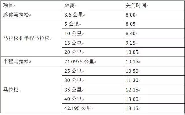 为了保证参赛选手比赛安全,限时对社会交通进行滚动封闭。比赛路线各段专设了赛事关门时间,到了关门时间,相应公里点的计时地毯停止工作,相应路段将恢复社会交通。在规定关门时间内,未跑完对应距离的参赛选手须立即停止比赛,退出赛道,以免发生危险。退出比赛的选手可搭乘沿途的收容车或选乘公共交通抵达终点。