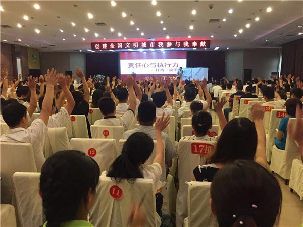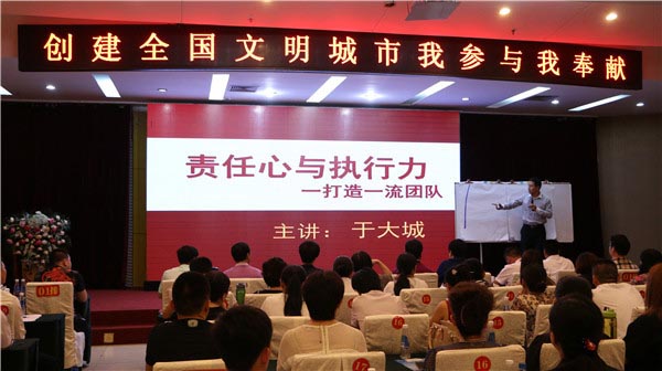 在旅游旺季到来和创城的关键时期,协会为会员单位提供服务保障,为创城增光添彩,协会特邀中国员工培训第一人,国内实战派管理专家于大城老师,围绕《责任心与执行力—打造一流团队》作专题培训讲座。于大城老师以情动人,以理服人,学员易于感悟、接受并改善,从而达到了提升学员心态及素质的效果。市旅游总会有关领导及协会会长孙传胜、监事长惠希望、执行会长刘晓萌、田胜亮等领导班子全程参会,协会会员单位及市尧王酒业集团等非餐饮理事单位500余人参加了会议,充分折射出了我市酒店餐饮业对此次助力创城培训学习的重视、热情和态度。