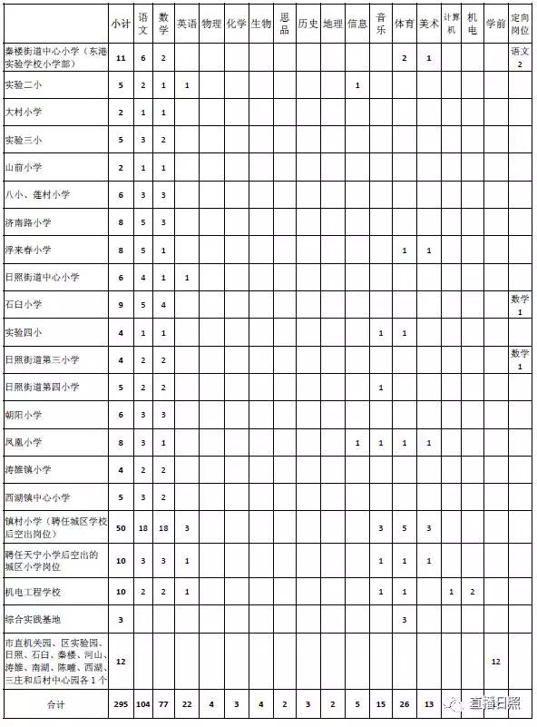 计划招聘教师295名,其中职业学校13名、初中70名、小学200名、学前教育12名(具体情况见《东港区2017年招聘教师岗位一览表》)。