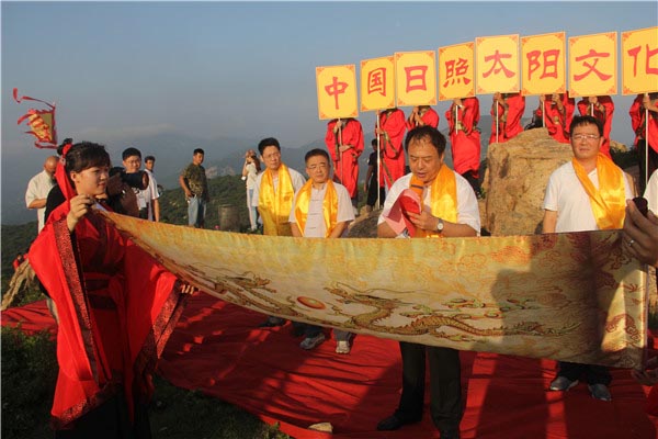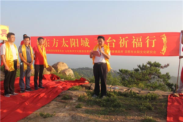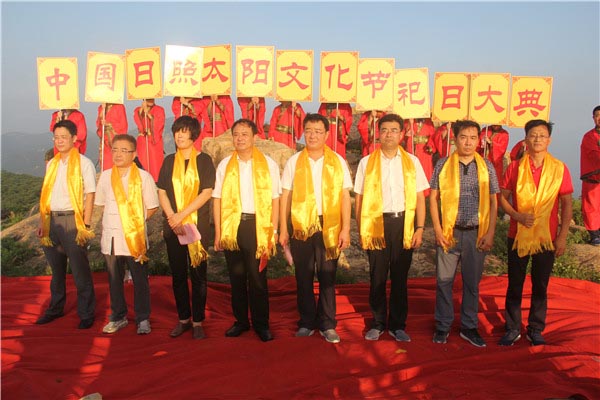 7月12日上午,由市旅发委、海洋文旅公司、涛雒镇政府、市太阳文化研究会联合举办的2017中国•日照太阳文化节暨祀日大典在天台山举办。日照市市委、统战部部长、市太阳文化旅游度假区管委会主任杨留星,市旅发委主任、市太阳文化旅游度假区管委会副主任王均波,市太阳文化旅游度假区管委会副主任、山东海洋文旅公司党委书记董事长总经理赵东江,市旅发委副主任赵志超等领导出席开幕式。太阳文化旅游研究专家学者代表,市有关企业、金融机构、媒体、旅游协会组织负责人,涛雒镇部分村党支部书记和人民群众等300余人齐聚天台山,为太阳祝寿祈福。