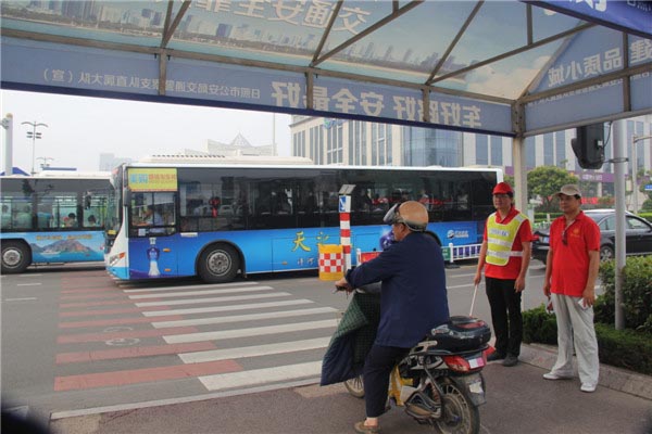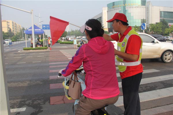 志愿者们举旗禁行,落旗放行,配合执勤交警指挥人车分流,耐心劝导市民按照道路交通标志及交通信号灯文明行路,引导机动车驾驶员文明驾车礼让斑马线,积极宣传“六大文明交通行为”,用实际行动共同为市民的交通安全保驾护航,为争创全国文明城市贡献力量。