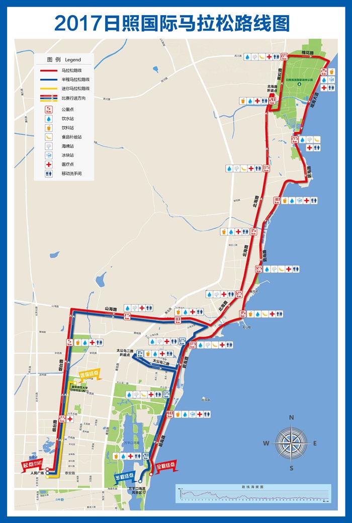 (一)全程马拉松:泰安路人民广场南侧 → 烟台路 → 山海路  → 北海路(左转)→ 日照海滨国家森林公园西门北侧折返 → 日照海滨国家森林公园西门 → 水杉路 → 黑松路 → 槐花路 → 观海大道 → 碧海路 → 万平口景区2号门南侧(终点)