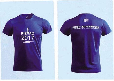 参赛服装正面采用了“2017日照”全拼和日照灯塔构成的赛事年鉴,背面是“日照银行·2017日照国际马拉松”赛事名称全名。马拉松、半程马拉松参赛者服装颜色为蓝色,象征着广阔海洋,舒爽的色彩感受,给参赛选手带来清凉。迷你马拉松参赛者服装颜色为橙色,寓意着健康与活力。