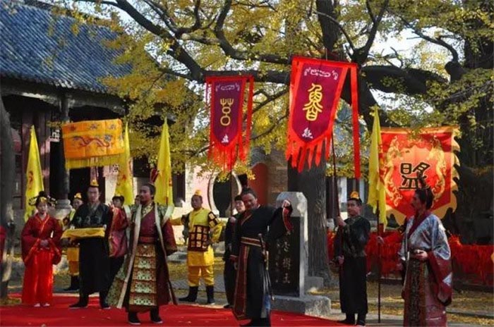 11月4日上午10点,在浮来山风景区举办莒县首届银杏节开幕式,书童打扮的小学生们朗朗诵读国学经典,展现莒文化传承至今的风貌。