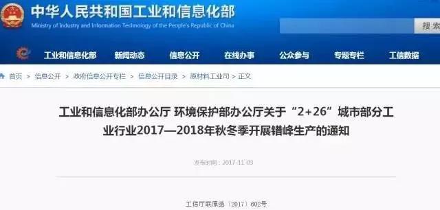 环保部、工信部联合下发通知,将开展“2+26”城市部分工业行业2017—2018年秋冬季错峰生产工作。