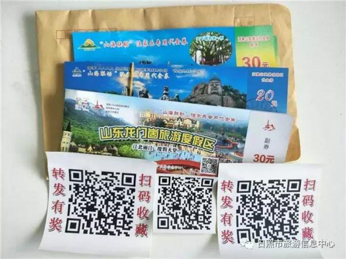 2016年山海天旅游度假区共接待游客1800多万人。为将我市海滨游客有效转换为山岳游客,延长游客在日照的滞留时间,进一步提升度假区的旅游竞争力和吸引力,促使全区的渔家乐更好地运用平台扩大营销阵地、拓展客源,山海天旅游度假区旅游局联合东港区旅游局、莒县旅游局、五莲县旅游局和文化体育广播电视局共同发起“山海联动”营销活动,游客通过扫码转发渔家乐的平台信息,各渔家乐民俗户赠送游客各景区的渔家乐专用景区门票代金券,游客持代金券进入景区可减免部分门票。以莒县浮来山景区为例,门票65元,代金券30元,游客只需交35元即可入园,相当于享受了门票半折优惠。
