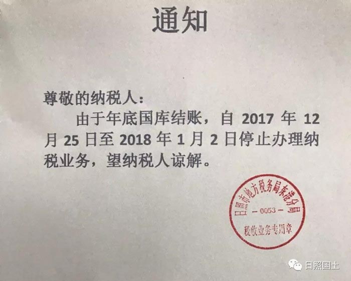 日照市不动产登记中心给您温馨提示如下:由于年底国库结账,地税部门自2017年12月25日至2018年1月2日停止办理纳税业务。望广大市民合理安排时间办理涉税不动产登记业务。