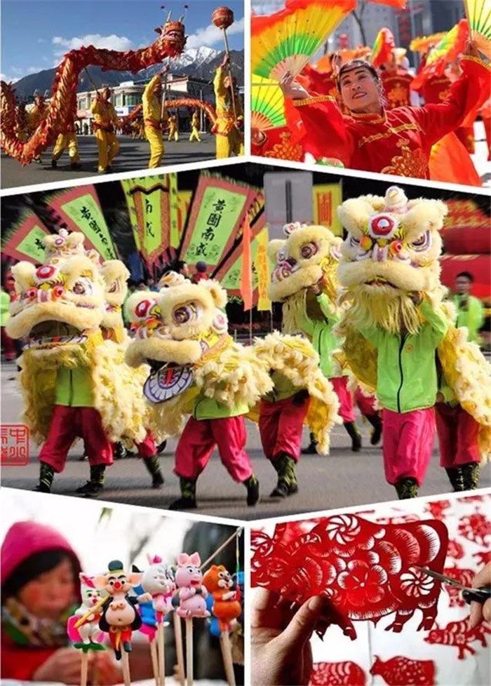 舞龙、舞狮、扭秧歌,捏泥人、剪纸等