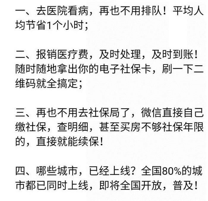 新版电子社保卡也将加速微信医保支付落地。目前,微信医保支付已与全国部分地方完成对接。